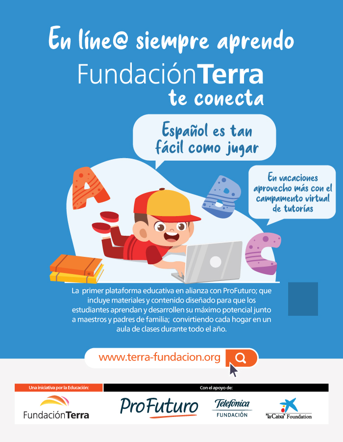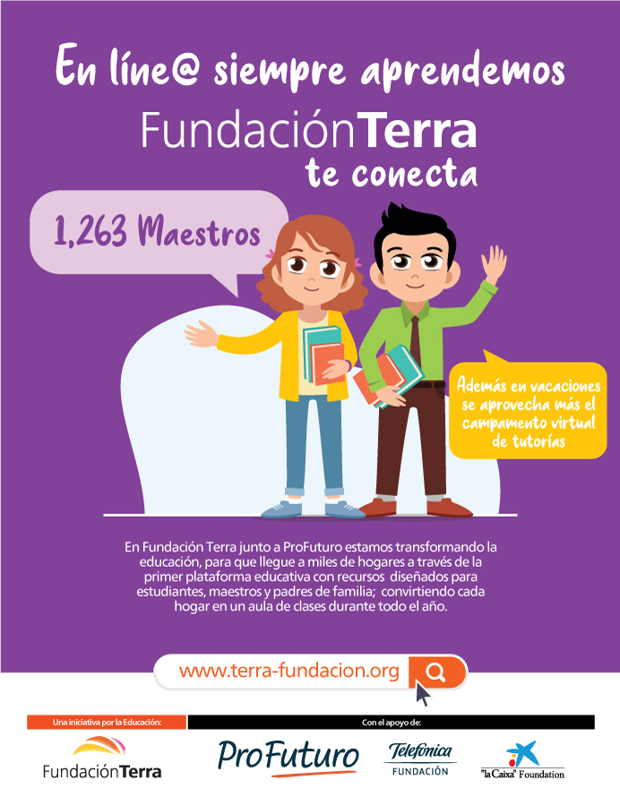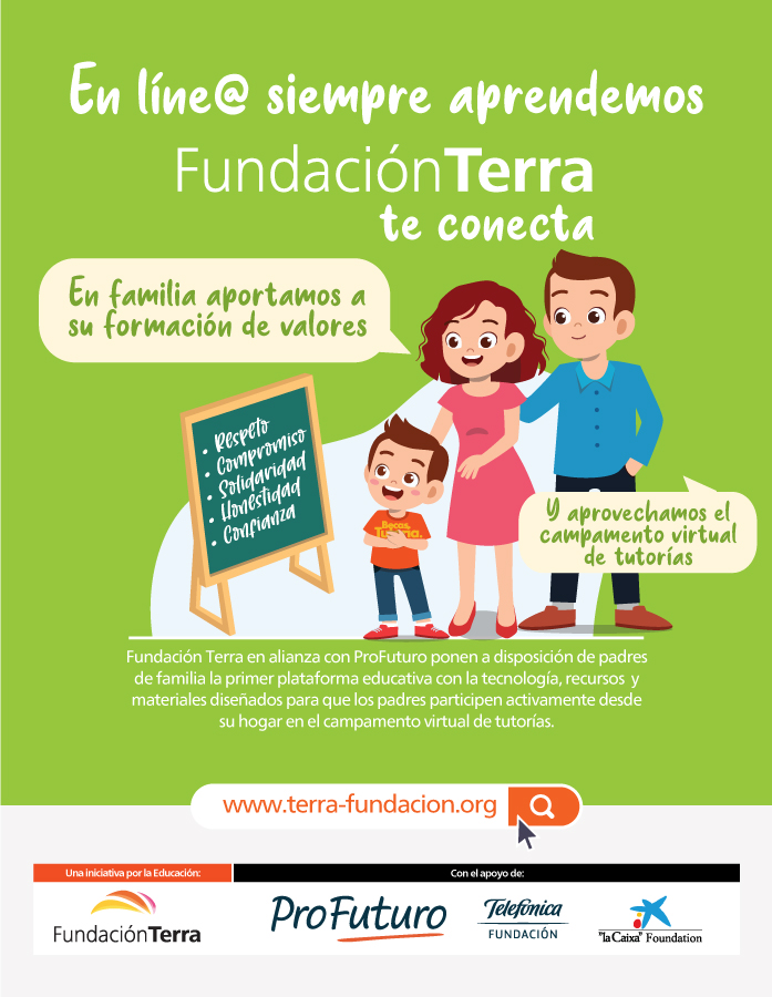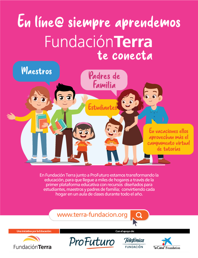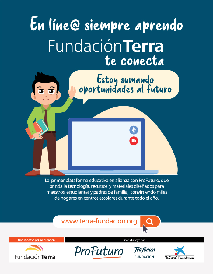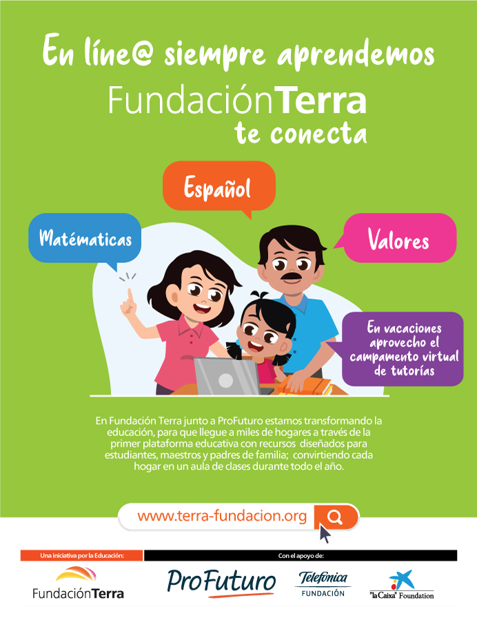 "Fundación Terra Te Conecta" nace como la primera plataforma educativa con recursos en las áreas de español, matemáticas y valores diseñada especialmente para estudiantes, maestros y padres de familia. Tiene como objetivo permitir Con ella se generará mejores oportunidades para el futuro de la niñez.